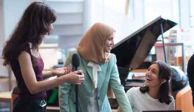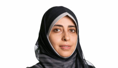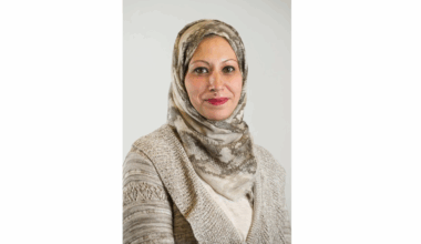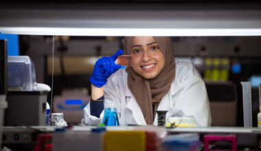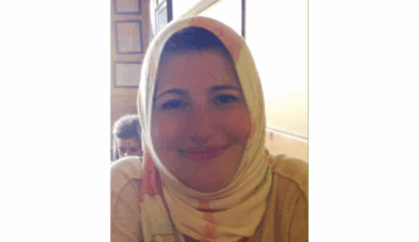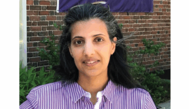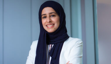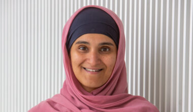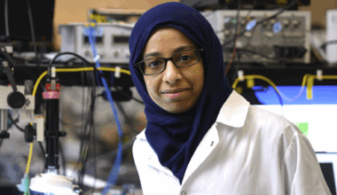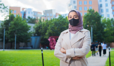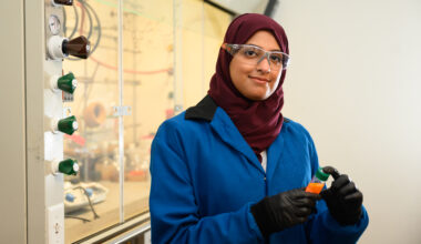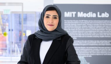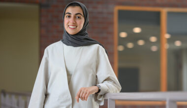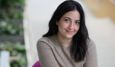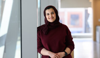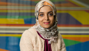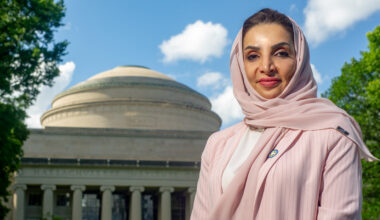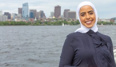 Sanaa wears a black coat and gray hat standing by MIT pillars